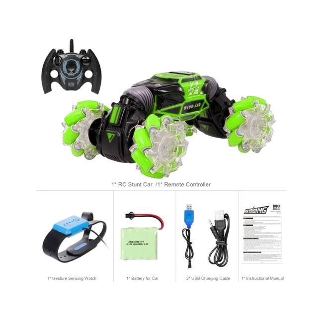У комплекті — машинка — перевертень, пульт керування 2,4 GHz, USB-зарядка, сенсорний браслет