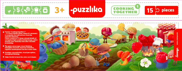 Пазли Готуємо разом 1 — це розвивальні пазли для малюків ТМ Puzzlika, дуже якісні та міцні, виготовлені з екологічно чистих матеріалів, складаються з 15 великих елементів упаковані в тубусі з кришкою. Рекомендований вік 2+, але можна використовувати й у ранньому віці.